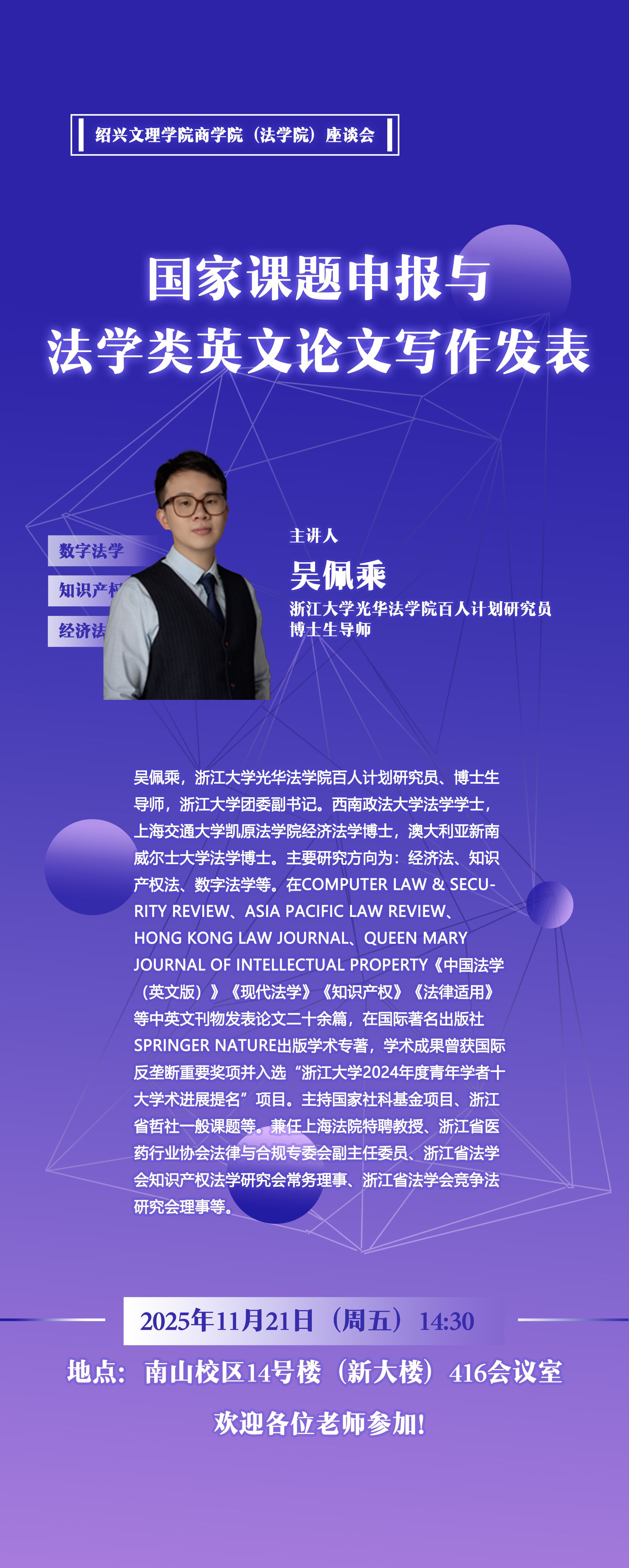 讲座主题:国家课题申报与法学类英文论文写作发表讲座人:吴佩乘 浙江大学光华法学院百人计划研究员、博士生导师