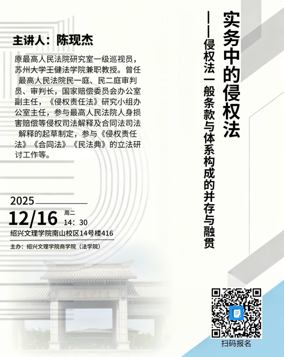 【讲座预告】绍大法学讲坛·第五期:实务中的侵权法——侵权法的一般条款与体系构成的并序与融贯