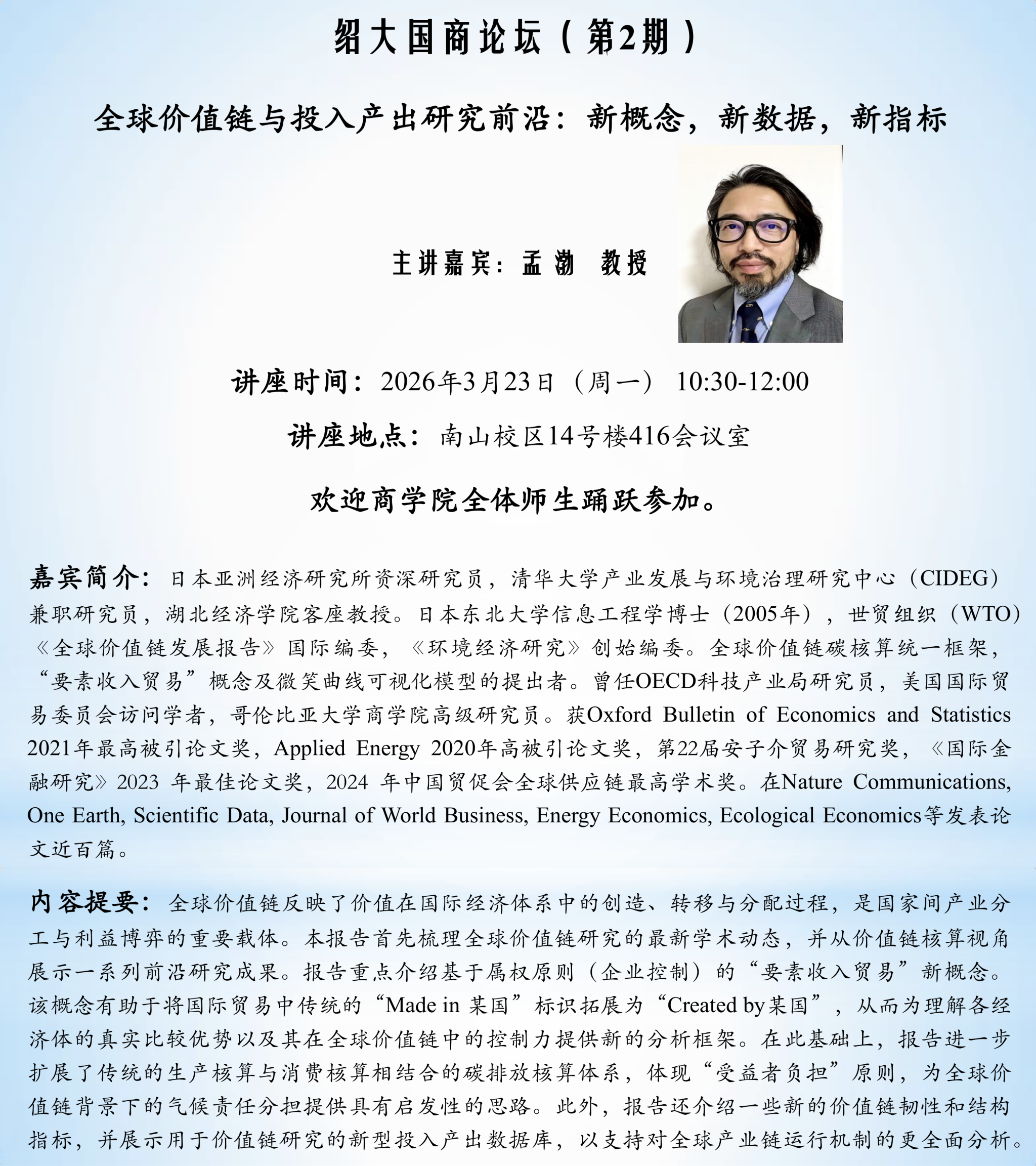 【讲座预告】绍大国商论坛(第2期) 全球价值链与投入产出研究前沿:新概念,新数据,新指标