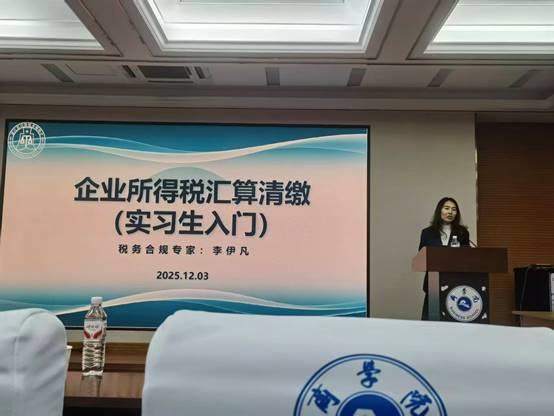 2025年12月3日晚,绍兴文理学院商学院主办的稽山会计论坛第33期在南山校区六号楼A405举行。本次论坛以“企业所得税汇算清缴实习生实操入门”为主题,特邀绍兴众远税务师事务所副所长、浙江省税务合规专家李伊凡担任主讲人,为师生带来了一场兼具理论与实操的专业分享。