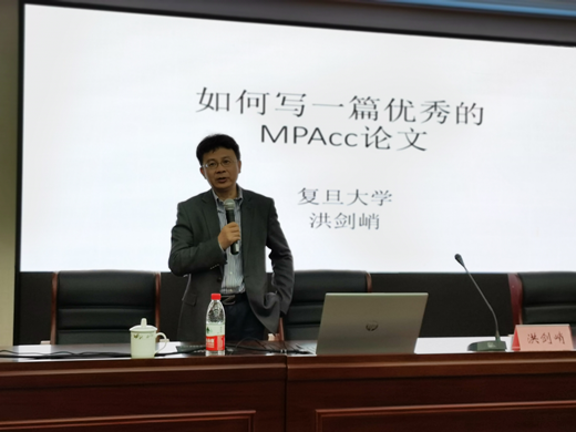 10月26日晚上,我院邀请上海复旦大学会计系主任、博士生导师洪剑峭教授举办“如何写一篇优秀的MPAcc论文”专题讲座,学院全体MPAcc学生和导师聆听了讲座。