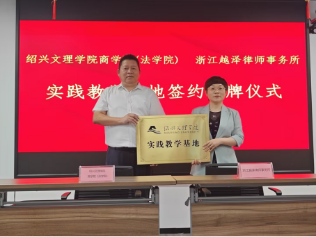 10月16日,绍兴文理学院商学院(法学院)与浙江越泽律师事务所合作共建“法学教育实践教学基地” 的签约暨授牌仪式,在浙江越泽律师事务所大会议室举行。绍兴文理学院商学院党委书记徐青、法律系主任董新辉、法律系党支部副书记徐肖东、专任教师汤方实、辅导员左诗婷,浙江越泽律师事务所主任张英、副主任陈权、副主任谭玲玲等出席签约授牌仪式。