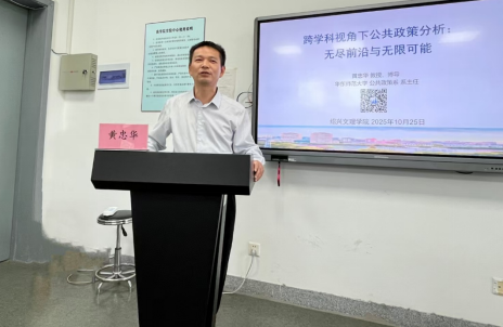 10月25日,绍兴文理学院商学院MPA教育中心为2025级新生举办了首场专题讲座。本次讲座特邀华东师范大学公共管理学院教授、博士生导师、公共政策系主任黄忠华担任主讲,以“跨学科视角下公共政策分析:无尽前沿与无限可能”为主题,为新生带来一场思想深邃、内容丰富的学术盛宴。讲座由商学院副院长邵青主持。