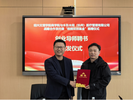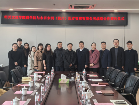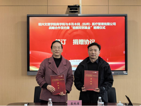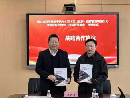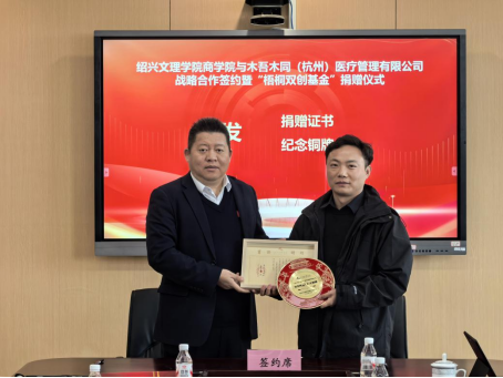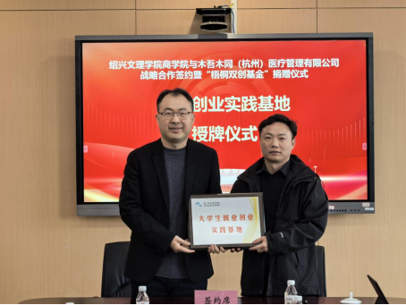 为深入贯彻“健康中国”与“数字中国”国家战略,助力浙江省“315”科技创新体系建设,12月3日上午,绍兴文理学院商学院与木吾木同(杭州)医疗管理有限公司在商学院416会议室举行战略合作签约暨“梧桐双创基金”捐赠仪式。木吾木同公司创始人、董事长刘文博,商学院党委书记徐青,以及学校相关部门负责人出席了此次仪式。仪式由商学院党委副书记周建强主持。