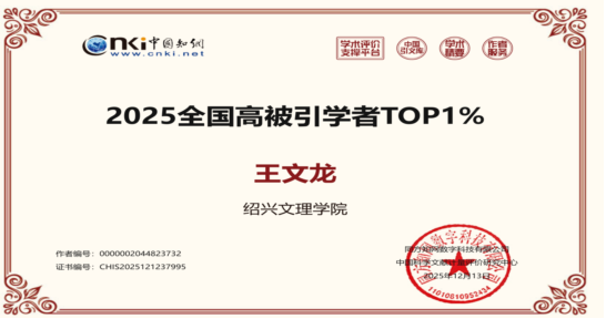 据悉,“中国知网高被引学者”遴选旨在客观、科学衡量并表彰近十年来国内科研成果丰富、学术影响力杰出的学者群体。王文龙教授连续两年入选榜单TOP1%,不仅是其个人科研实力与学术贡献的有力印证,也为我院的学科发展注入了新的活力。