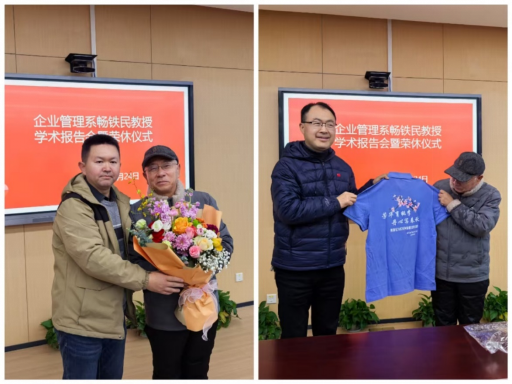 最后,赵江向畅教授赠送鲜花,丁志刚副院长向畅教授赠送文化纪念衫并表达谢意。企管系衷心感谢畅教授的辛勤付出,祝福畅教授身体健康、荣休生活一帆风顺,望敦厚学风与育人情怀薪火相传。