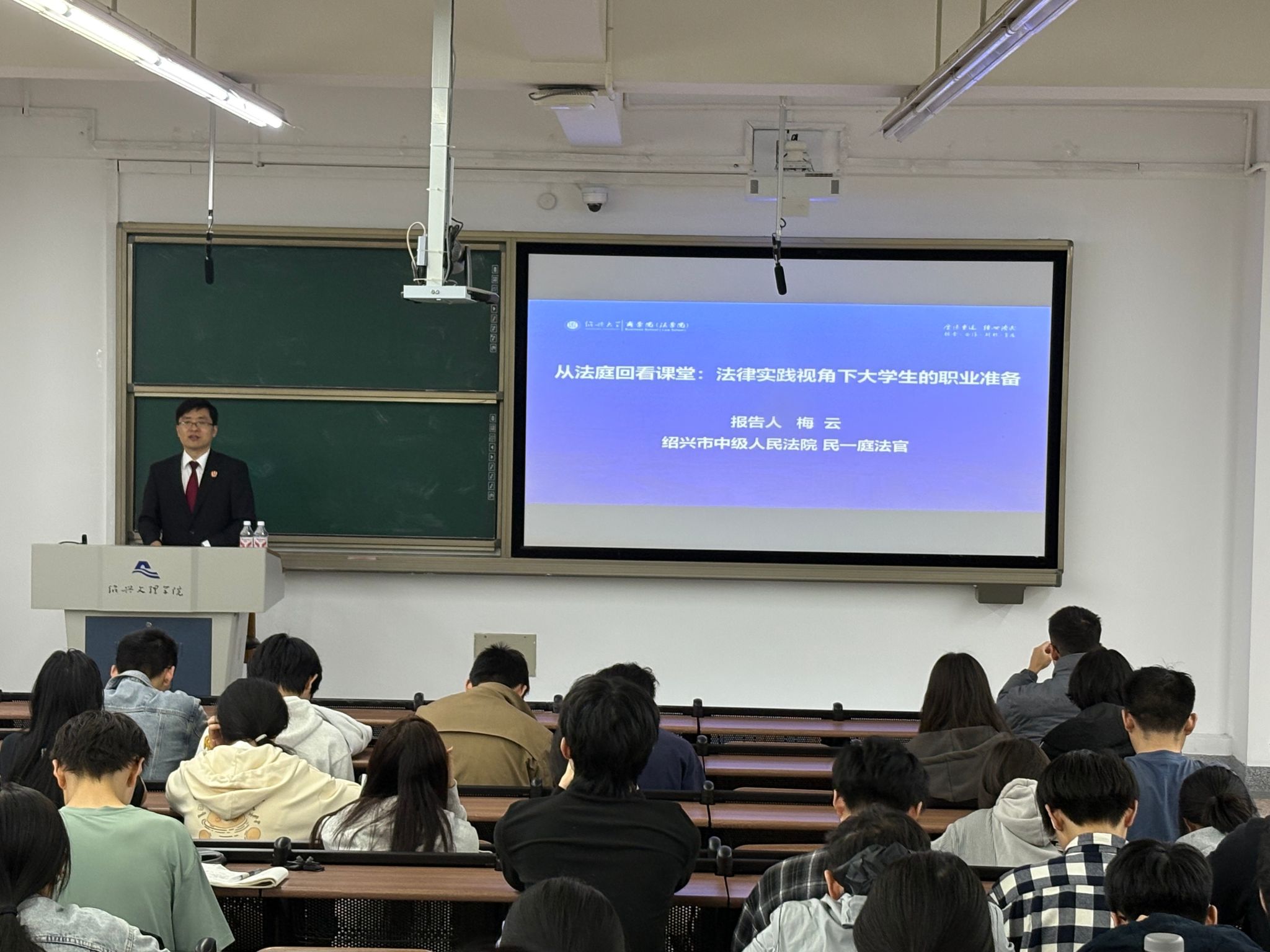 4月22日下午,我院特邀绍兴市中级人民法院法官梅云,为师生带来“从法庭回看课堂:法律实践视角下大学生的职业准备”专题讲座,共200余名师生参与活动。
